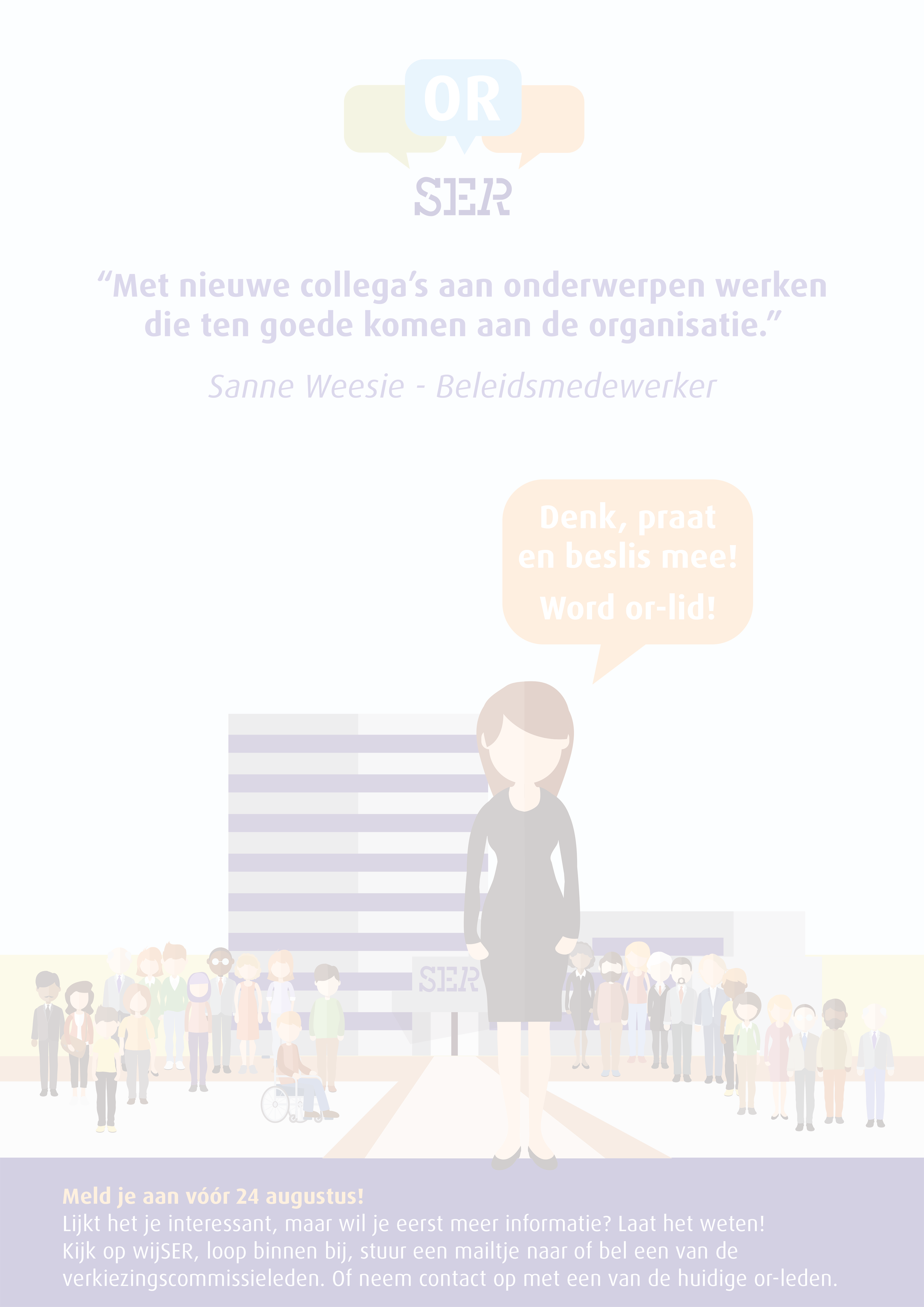 De ondernemingsraad (OR) is er voor inspraak en medezeggenschap in onze organisatie. Een vertegenwoordiging van het personeel denkt mee en adviseert de algemeen secretaris bij allerlei onderwerpen die de SER en zijn medewerkers aangaan. In totaal bestaat de OR uit zeven leden. Wil je op de hoogte gehouden worden over alle updates van de OR? Dan kun je je voor de wijSER groep OR aanmelden.